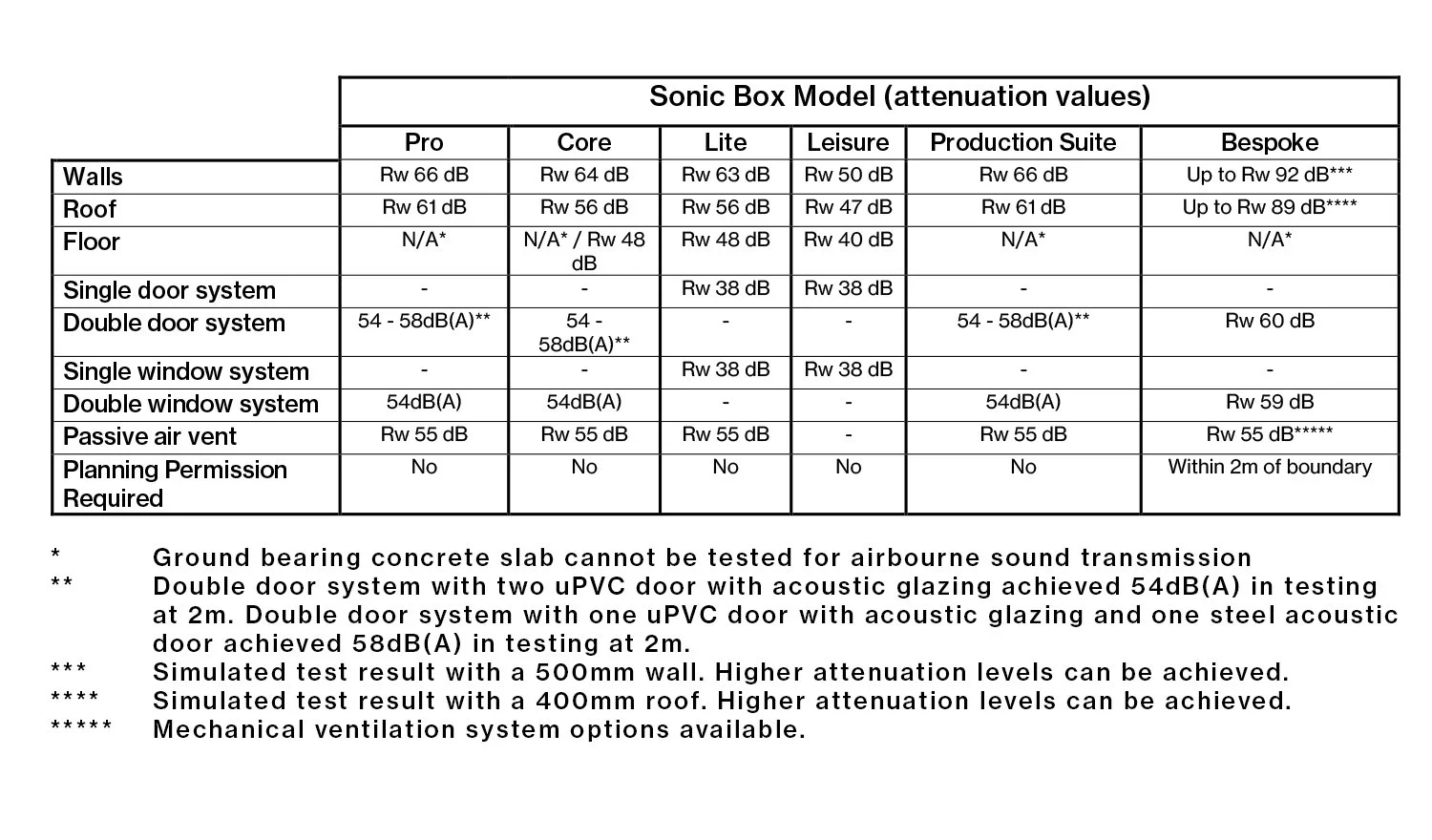 Here is a breakdown of the attenuation values of each of the Sonic Box model build ups and components. These can be tailored to suit your specific soundproofing needs as required. More information can be found here.